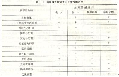 病原微生物可通过空气、水、食物、母婴、血液、接触、虫媒和土壤等自然途径传播,也可通过实验操作过程中吸人含病原体的气溶胶、经口摄入病原体、被污染的针或刀片刺伤或割伤、动物或昆虫的咬伤或抓伤以及病原体经皮下或黏膜透入等非自然途径传播。常见病原微生物危害的主要传播途径见表5一1。